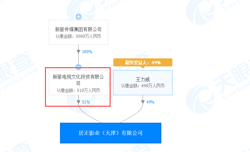 我们再深扒一下这个王力威的公司,发现了一家名叫“天津居正影业有限公司”,我们可以从股权发现一个熟悉的身影,没错,这就是新丽传媒旗下的“新丽电视文化投资有限公司”,他持有这家公司51%的股权,而王力威单独持有这家公司49%,要知道,51%股权意味着有了这家公司绝对的控制权。
