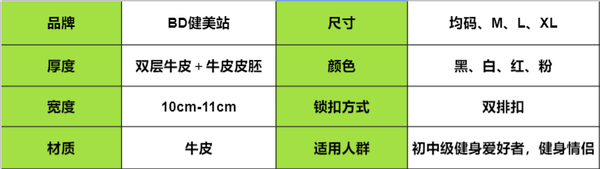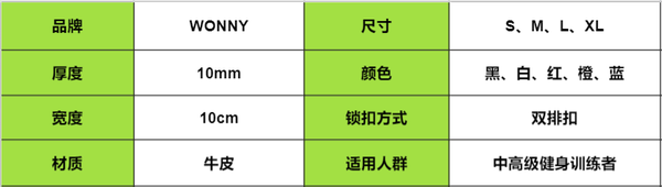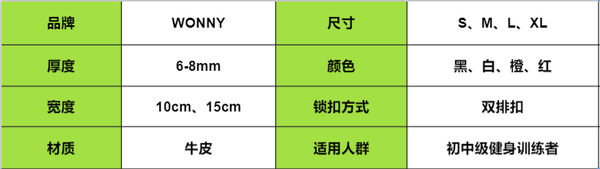 个人评价:WONNY的腰带口碑一直以来都不错,这款腰带适合初中级训练者,分为两款:标准款10cm,加款款15cm。