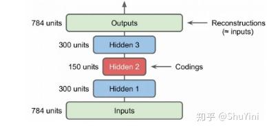对于MNIST来说,其输入是$28*28=784$维度的特征,这里使用了两个隐含层其维度分别为300和150,可以看到是不断降低特征的维度了。得到的最终编码为150维度的特征,使用这个特征进行反向重构得到重建的特征,我们希望重建特征和原始特征尽量相同。