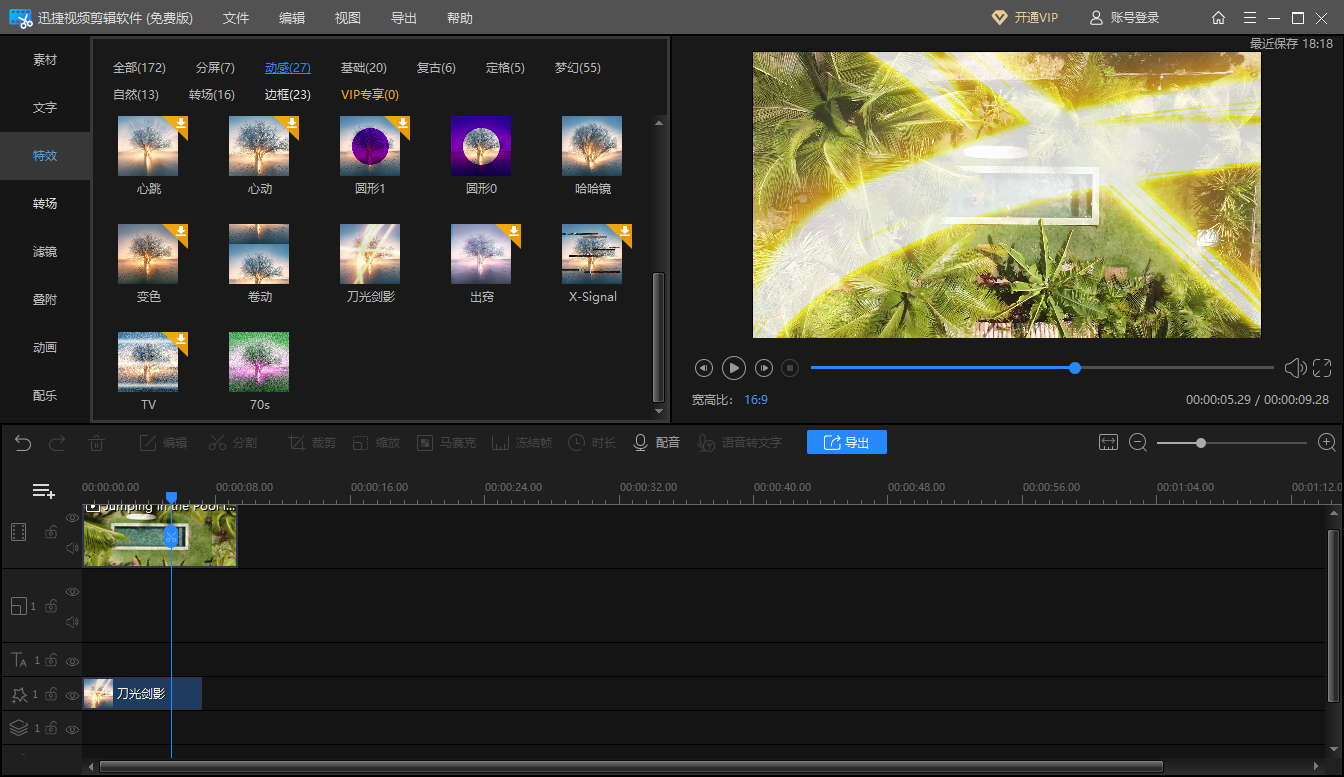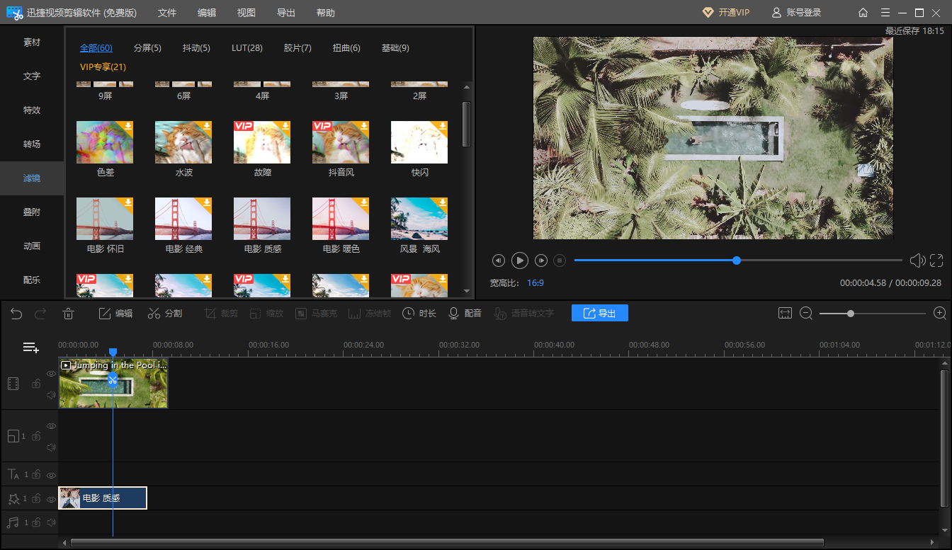 软件的 素材库 也比较丰富,还有 N 多的滤镜和特效可以选,支持多轨道同时裁剪,不需要专业基础,小白也能直接上手。