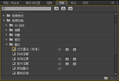 在PR的效果箱里,我们可以找到很多视频切换效果,这就是通常所说的转场特效。