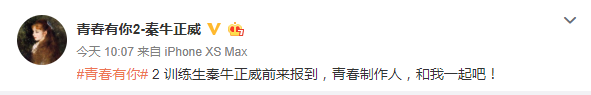 牛姐在微博官宣自己参加《青春有你2》的消息
