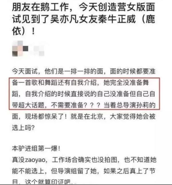 有网友路透表示秦牛正威在面试时不仅没有准备舞蹈,还非常自信地对总导演说自己