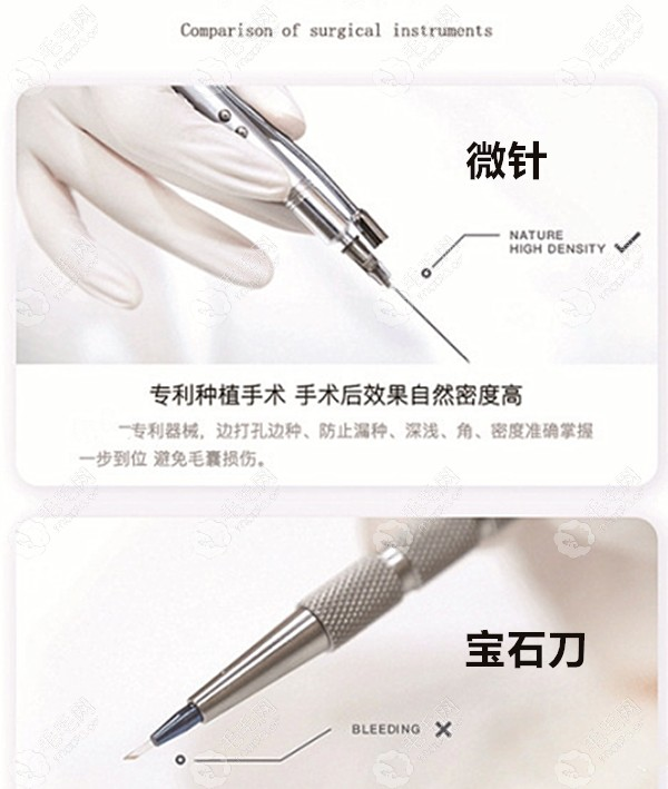 宝石刀是目前大部分机构用的仪器,它的好处就是速度快,因为可以两个人用两个宝石刀同时种植,但是宝石刀一般是一次性打孔,可能打多或打深,损伤面积大,而且皮肤可能凹凸不平。因为他要综合考虑收费,他原生的头发质量好不好,他需要种植的头皮区域原生的头发多不多,如果都是一片光茫茫的,然后再考虑性价比的话, 那用宝石刀打孔就可以了。