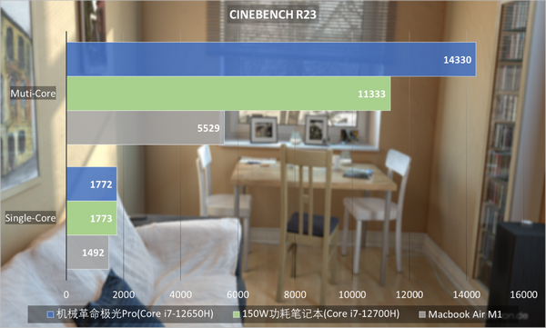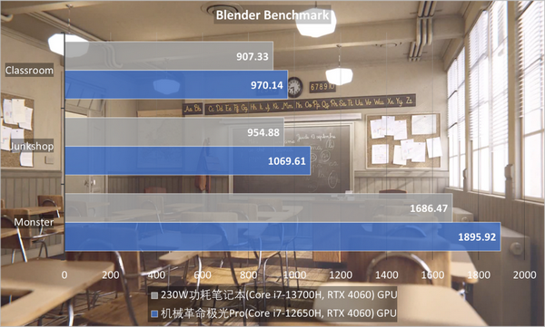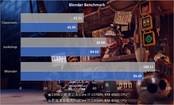 同样在Blender Benchmark场景中,GPU也占了优势,CPU部分Core i7-12650H弱于Core i7-13700H情有可原。