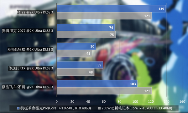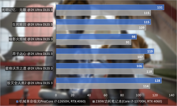 让人较为意外的是,机械革命极光Pro在处理器上吃亏没有在实际的游戏中拉开太多差距,相反在某些场景下与230W功耗同级别的游戏本战得有来有回。