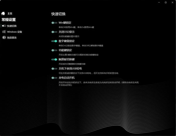 同时,机械革命极光Pro的模式切换还能还可以在机械革命电竞控制台中自定义和调整,在控制台中,还能设定Win键锁定、OSD显示、USB充电、独显直连等多个选项,并且还能调整1600万色RGB键盘背光。不过可惜的是机械革命电竞控制台似乎没有默认的快捷键快速启动,需要自行在开始菜单中查找。