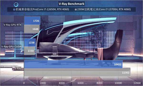 渲染输出环节,这里分别选用了V-Ray Benchmark和Blender Benchmark作为测试,主要考验笔记本的渲染性能,以及CPU输出、GPU CUDA和GPU光线追踪性能。在V-Ray Benchmark场景中,可以看到GPU表现突出。