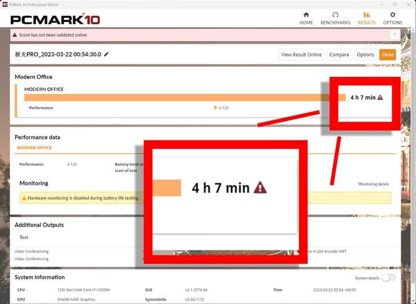 在笔记本的续航表现中,在办公模式下将笔记本屏幕设置成50%,运行PCMark 10的现代办公模式,获得的续航时间为4小时左右,可以看出笔记本自带的电池容量不大,从而减轻了笔记本体积,不过对于机械革命极光Pro追求性价比的目标用户而言,4小时的续航不是什么大问题,毕竟可以带着更小尺寸的SiC电源出门,一劳永逸解决续航焦虑。