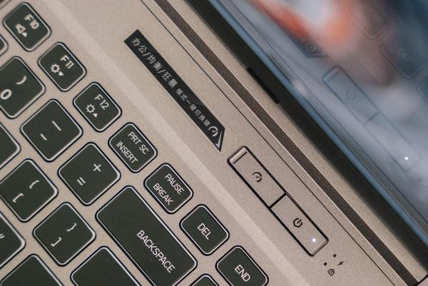 在机身C面,机械革命极光Pro也坚持着这样的简约主义,比如前面性能测试中会用到的狂暴模式按钮就安排在电源键旁边,通过一键切换办公模式、均衡模式和狂暴模式,每一个模式都会有相应的LED背光提示,即使不看屏幕通知,也能便捷知道自己的笔记本处在什么状态下。