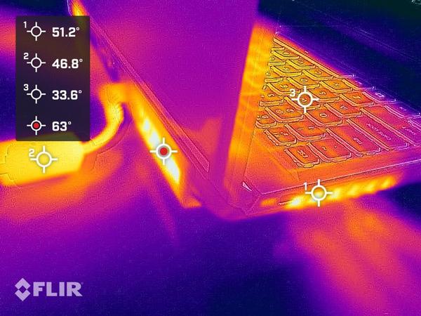如果从侧面观察则可以看到出风口温度可以达到63℃左右,并且考虑到机械革命极光Pro背面镂空的散热设计,盛夏的时候也可以为笔记本添加一个散热垫。