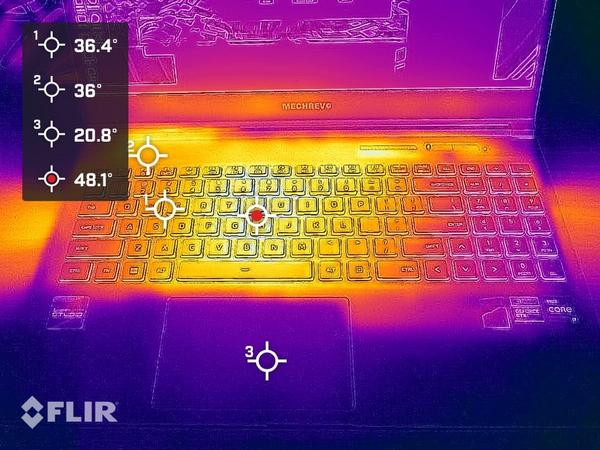 在环境温度22℃室温内,笔记本C面的最高温度为48.1℃,在GH按键下方,触控板和掌托则保持足够清凉。