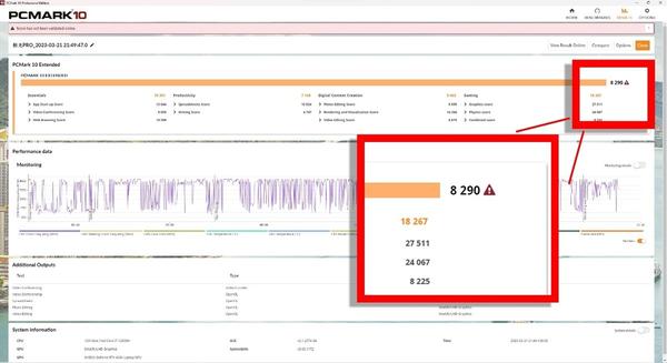 除此之外,机械革命极光Pro的硬件配置还包括,16GB DDR4-3200双通道内存,512GB NVMe SSD。这里让我们直奔主题,通过CrossMark、PCMark 10 Extended验证笔记本的整体性能,具体表现如下,10核的Core i7-12650H与RTX 4060 Laptop GPU提供的整体表现不出,维持在主流的水准。
