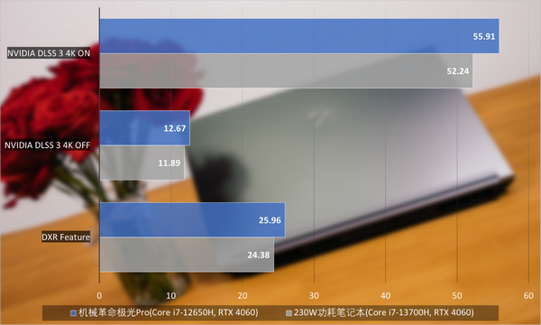 同样在DXR Feature和DLSS 3的测试中,RTX 4060 Laptop GPU的性能释放也非常亮眼。