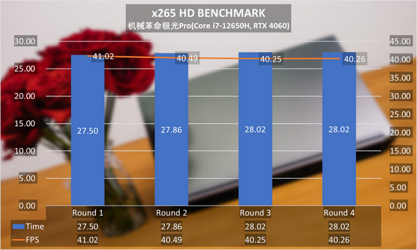 最后是连续四次x265 HD BENCHMARK检验笔记本的视频输出能力,四轮之后性能下降不明显,从而也证明了机械革命极光Pro持久的创作能力。
