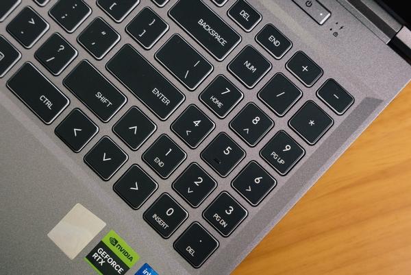顺带一提,机械革命极光Pro的小键盘设计颇有意思,原本的加减乘粗按键被移动到了右上角,取消了最右侧的小键盘回车键,同时方向键与小键盘共享空间,以确保方向键面积。