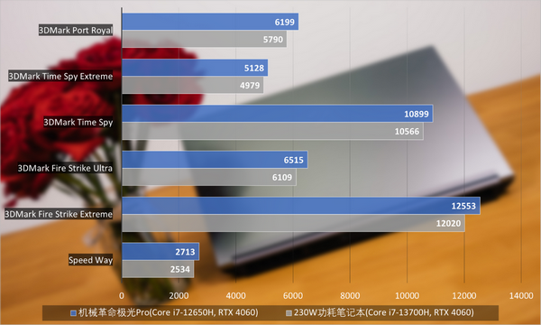 GPU测试部分我们则选用了3DMark Speed Way、3DMark Fire Strike Extreme、3DMark Fire Strike Ultra、3DMark Time Spy、3DMark Time Spy Extreme、3DMark Port Royal作为参考。可以看到Core i7-12650H + RTX 4060 Laptop GPU的表现同样可圈可点,甚至比一些趋向于轻薄调教,但同样是230W功耗调教的13代酷睿笔记本更胜一筹,属实让人有些意外。