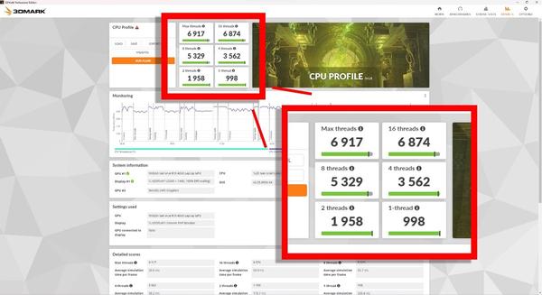 同样在注重游戏性能的3DMark CPU Profile中,Core i7-12650H表现依然强力。