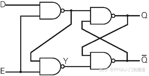 结构组成:由4个NAND组成,输入信号有D(DATA)和E(ENABLE),输出信号有Q和/Q。