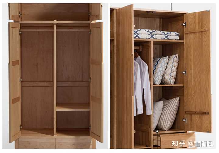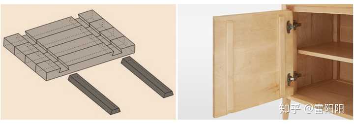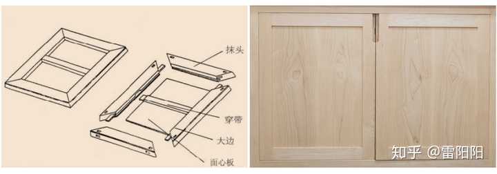 下图是衣柜柜门的案例,左侧是攒边装框+两条穿带的结构,右侧是面板+衬木拧螺丝的结构。显然左侧的结构更稳定,使用期限更长。右侧的衬木数量少、尺寸小,衬木上也未开槽,变形与开裂的几率较高。