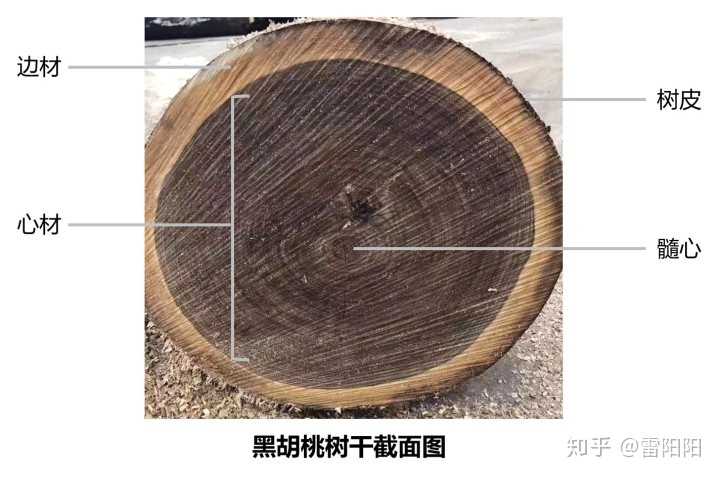 下图是黑胡桃原木截面图,靠近木材髓心,材色较深的是心材,靠近树皮,材色较浅的是边材。