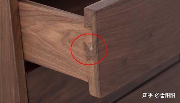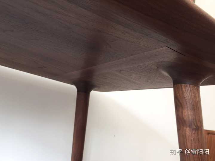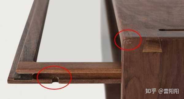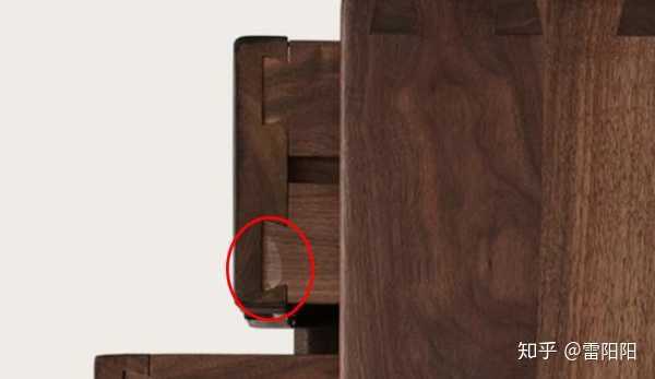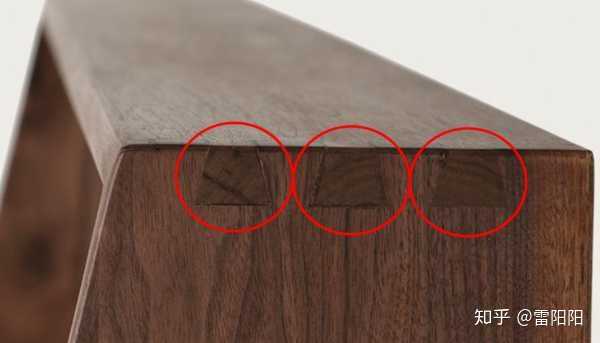 因为涉及手工,国内厂家做明燕尾榫的家具常有 细节问题 , 后期填补 是最常见的。下图的黑胡桃家具三个榫都有填补。