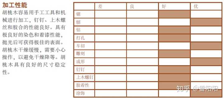 黑胡桃表现均是 “好”和“优” ,属于 易加工 的木材。黑胡桃具有 良好的尺寸稳定性 。据我们的经验,黑胡桃的稳定性是优于硬枫、白橡、榉木等木材的。同样的环境变化,对黑胡桃的影响相对小一些,但这不意味着黑胡桃不会开裂或形变。木材没有烘干、结构不合理、制作不到位以及使用不恰当,仍会出问题。