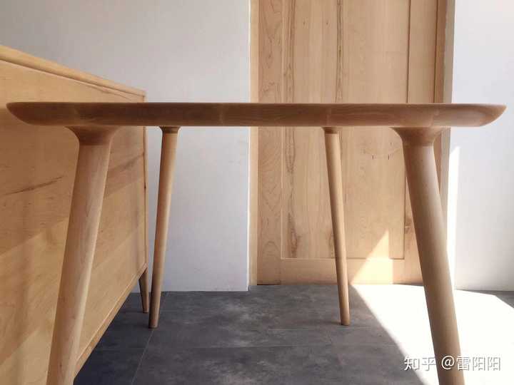 结构设计也体现在家具的稳固、承重等方面,要考虑使用性能的同时还需兼顾外形美观。下面这款餐桌的支撑只用了四条腿,腿之间没有其他连接。桌面与腿的连接以圆弧过渡,腿顶端是双榫,透过圆弧托插入桌面,这样的结构设计增强了稳固性,同时外观简洁,视觉流畅。