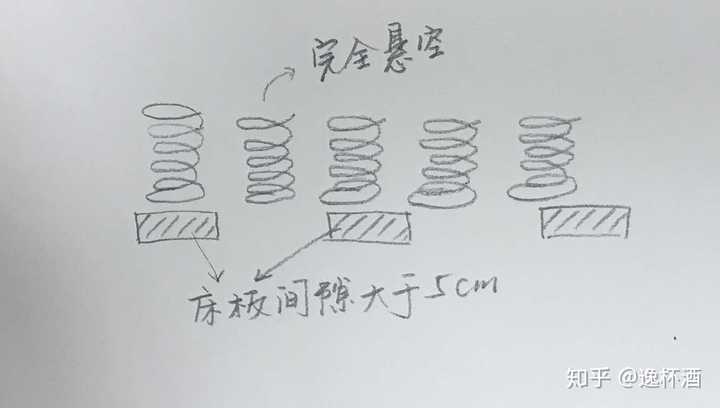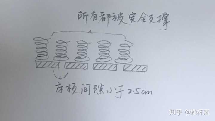 而小于2.5cm的缝隙,就可以保证每一个弹簧,要么中心被支撑,要么两边同时被支撑,再也不会有不完全支撑的情况存在。而且小于2.5cm的缝隙,即使不使用床垫,直接铺上褥子睡上去,也几乎感觉不到缝隙起伏,甚至夏天直接睡上去都可以。所以2.5cm是衡量一个床板够不够考究的核心数值。