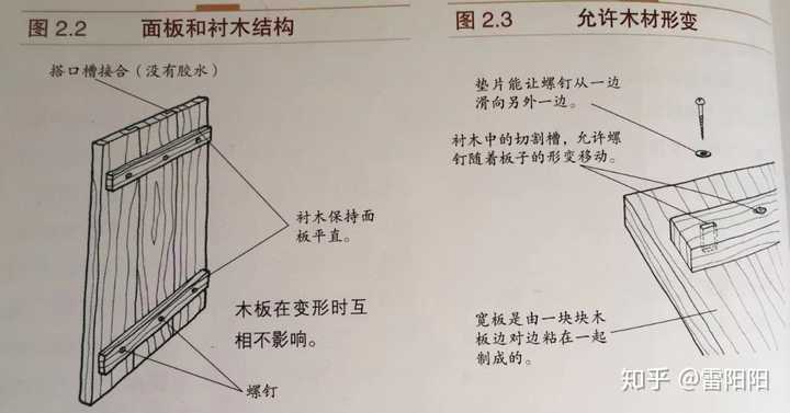 下图是面板+衬木拧螺丝的结构,出自《彼得科恩-木工基础》。面板和衬木的结构与中国的穿带结构原理一样,利用衬木控制住面板的形变。这种结构有两种形式,左侧的结构中,每块板子之间没有上胶水,只是被螺丝固定在衬木上,每块板子都能自由伸缩,缺点是板子间会有不均匀的缝隙,不适合做桌面、几面。右侧的结构中,面板是一个整体(拼板间胶水固定住),为了让面板伸缩,衬木拧螺丝的位置需要切割出槽,能让螺丝随着面板形变而移动。
