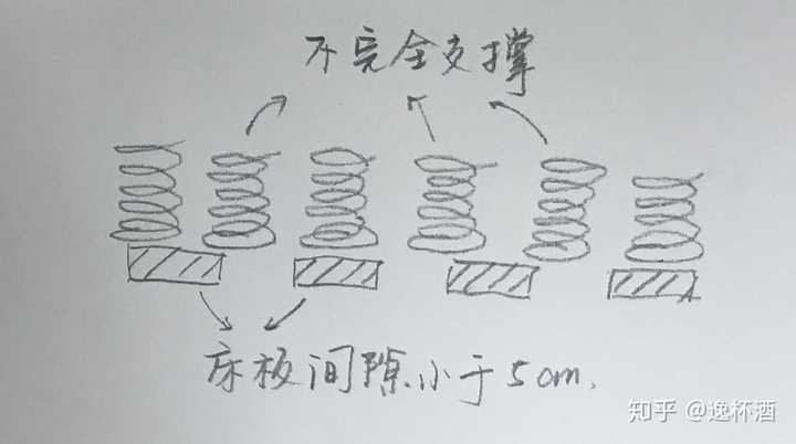 小于5cm的缝隙,就可以让每一个袋装弹簧都收到支撑,但是我们还是可以发现,很多弹簧其实也只有边缘搭上了一点点床板,支撑并不充分,实际还是歪歪扭扭的。