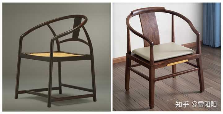 下面的两把圈椅是国内的作品。风格更中式,各有特点。就造型设计水平而言,左边这把是明显优于右边的。椅圈曲线优雅、比例协调,扶手弧度、后腿角度以及脚踏后移的设计更显功力。