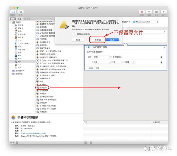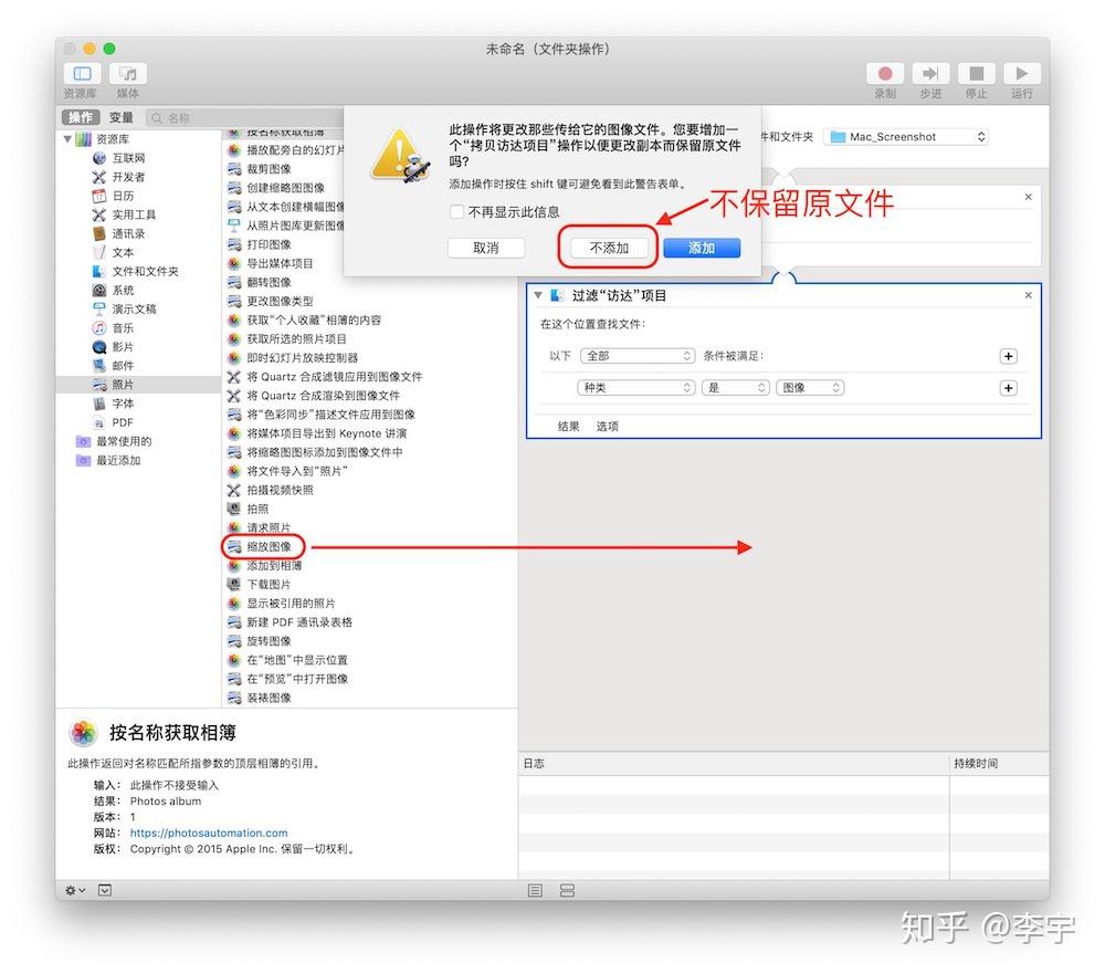 4. 之后将”照片“中的”缩放图像“拖到右侧面板中,随后将会弹出一个选择框,让你决定是否以拷贝的方式保留副本,这里随你自己的情况而定,我这里就选择了”不添加“,直接在原图上进行修改而不保留原图;