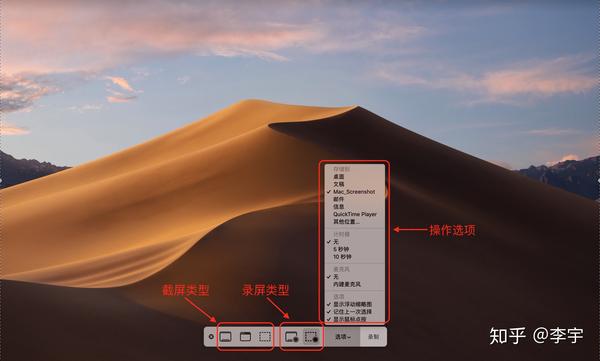 前面介绍了如何使用快捷键进行屏幕截图,以及如何更改截图的一系列参数。在macOS Mojave系统版本中,又增加了一个非常强大的App—“Screenshot”,将这些功能整合到了一起,让你可以同时选择截图类型、修改参数,还可以进行屏幕录制等等操作。Screenshot这个App代替了之前老版本中的Grab,你可以在Application(启动台)面板中打开它,也可以直接使用快捷键Command + Shift + 5启动。打开之后的面板如下,你可以在其中选择自己想要进行的操作: