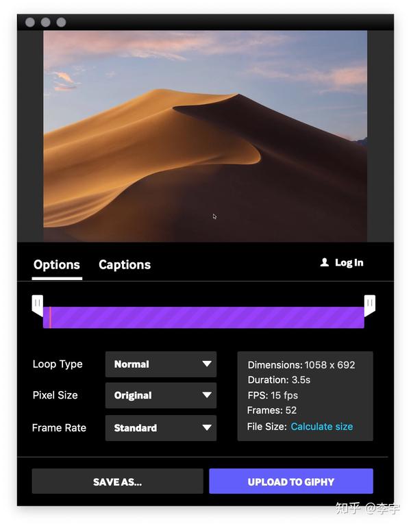 随后成功录制的截屏就会显示在界面的下方,点击缩略图就能进入对应的属性面板,在这里你可以设置时间范围、循环类型、像素大小、帧率等参数,随后点击”Save as“你就可以将其保存为GIF格式的文件了。