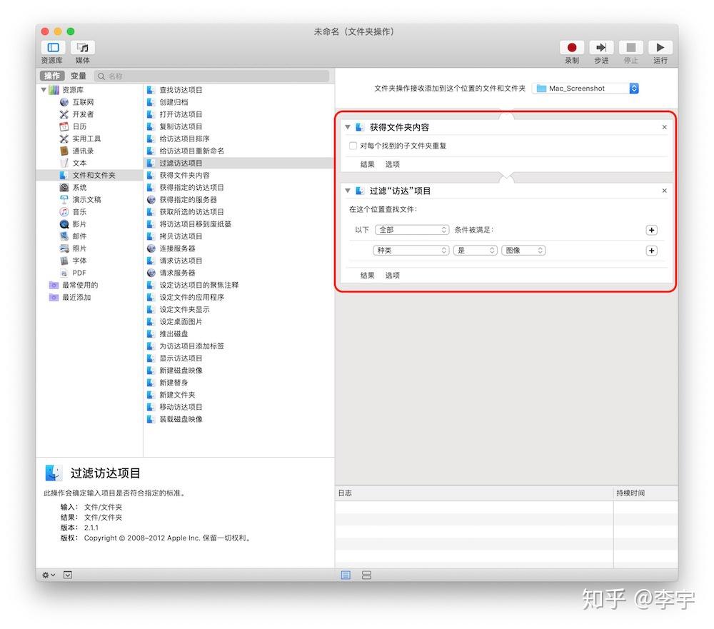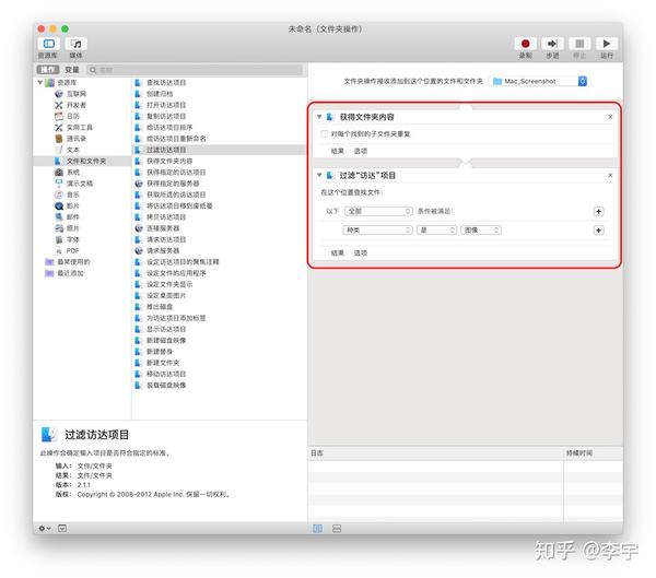 3. 然后按先后次序将”获得文件夹内容“和”过滤访达项目“拖入到右侧面板中,将”过滤访达项目“的过滤条件设置为”种类—是—图像“。第一步是为了获取该文件夹中添加的项目,第二步是过滤出图片类型的文件;如果该文件夹下还有子文件夹,同时你也想对所包含的子文件夹使用该工作流,则”获得文件夹内容“中的”对每个找到的子文件夹重复“需要被勾选上;