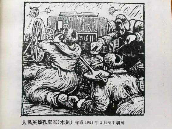 《烟台日报》原副总编辑孙佑杰是抗日战争时期入伍的战地记者,参与了抗美援朝的战地采访报道,他在1951年2月用木刻将孔庆三的英雄形象展现出来,流传后世。
