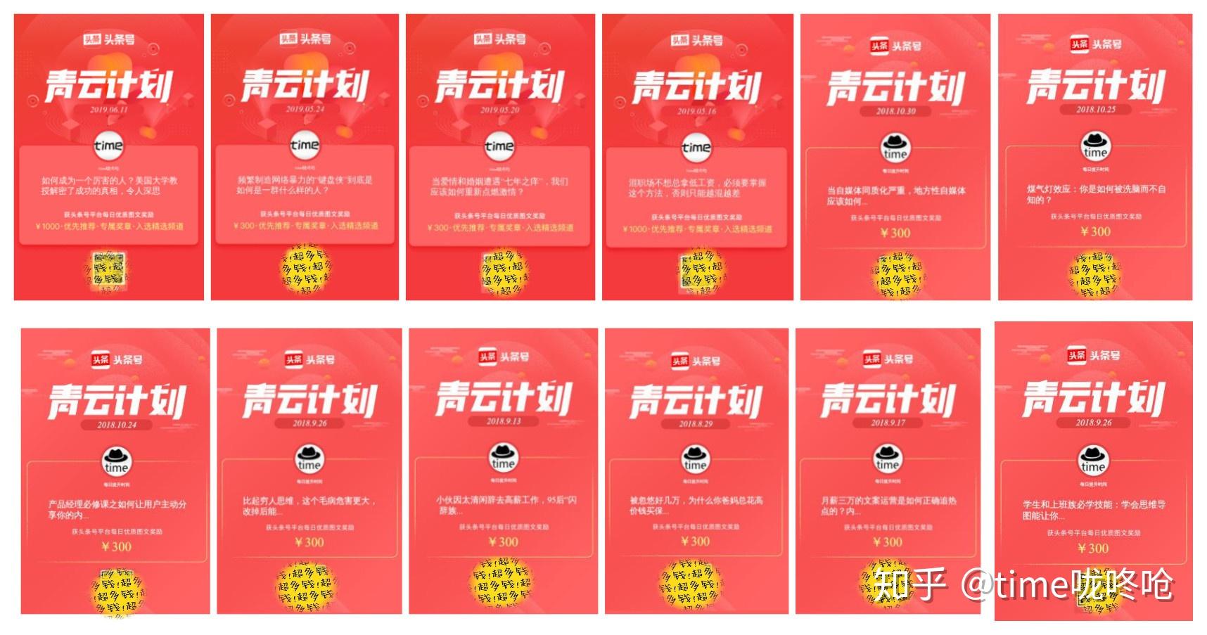 今日头条的青云计划规则是,每月首次入选,一篇给1000元,其余的每篇给300元。