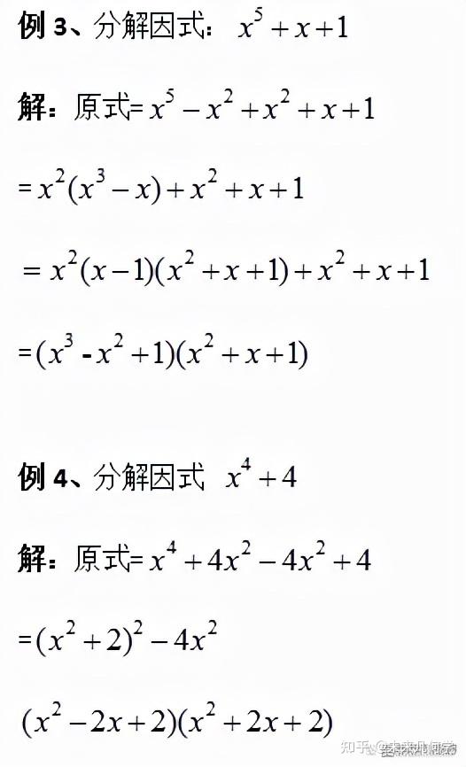 以上就是因式分解拆项法和添项法的使用技巧。不过,只有我们认真掌握了因式分解的四种基本方法:提公因式法、公式法、十字相乘法、配方法,然后再结合拆项法和添项法灵活应用,才能有的放矢,融会贯通。