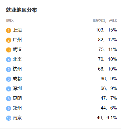 研究生毕业后,上海、北京、深圳等城市就业机会比较多,排名大致如下: