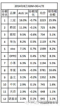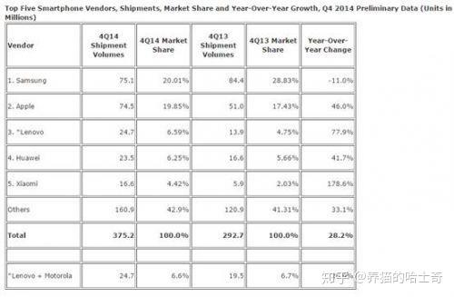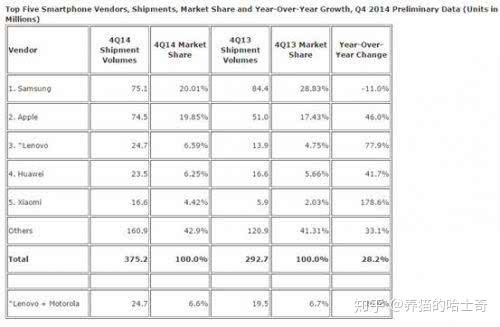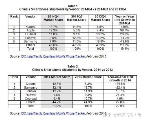 而到了2014年Q4国内市场占有率已经被小米超越,2013年还在酷派联想之后。