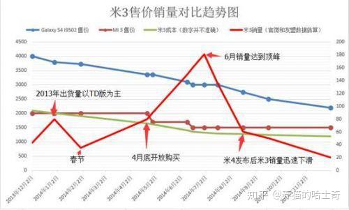 ,在这里我们引入三星Galaxy S4 I9502作为对比(数据来自慧慧购物助手对京东的售价统计),成本数据跟太多因素有关只是大概的估计(请不要太较真),米3的销售数据5月份之前来自于官方微博,5月份之后来自于友盟的数据估算。三星是很传统的厂商定价和销售,在产品初期定价较高利润也很大希望快速收回成本,随着时间的推移而慢慢降价。