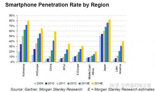 我们的经济还在发展,收入还在增长,智能手机的普及率也在不断的提高,跟美日韩比我们还有很大的提升空间,各国智能手机渗透率参考下面Morgan Stanley的报告截图。根据IDC的数据,即便是智能手机渗透率最高的日本在总务省对于通信行业的销售奖励金战略大幅变更的情况下2014年Q1依然有914万台出货量,其中智能机651万台,Q2 有737万台,智能手机492万台,日本的总人口是1.26亿。所以说中国的手机市场还是有不小的空间的,但是大规模的换机潮已经濒临尾声,未来的竞争将会更加的激烈,将面临一次洗牌。