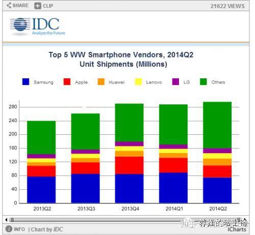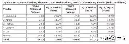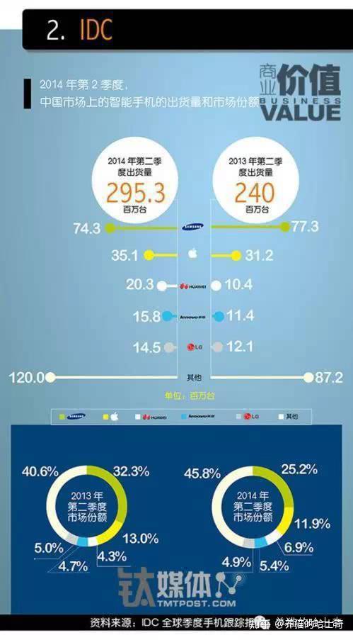 首先我想说的是大家看新闻一定要多思考,各个厂商的水军还有狂热粉丝说的话要分辨清楚,另外一些所谓的科技媒体也要看清楚,不要轻易相信。比如下面这个报道:【独家图解】中国智能手机市场到底谁老大? 里面的问题很多我只说一处,首先这篇报道的标题是说中国手机市场,内容是将一些市调机构的数据做成漂亮的图表展示出来。那我们就来看这张图,数据来源很清楚:IDC,内容也很清楚“2014年第2季度,中国市场上的智能手机出货量和市场份额”,下面是数字:2014年第二季度出货量295.3百万台,这是将近3亿台呀,中国市场一个季度就能有这么多手机?那岂不是一年下来全国人的手机都要换新的了?