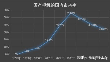 可以说当时在国内手机还是新鲜事物,国产手机更属于刚刚起步的阶段,出台一些规定加以保护和诱导也是理解的,但是手机牌照这种方式是否合适呢?我们还是看下面的发展再讨论不迟,从1999年起信息产业部挺直对外资企业发放牌照,2000年5月,信息产业部决定不再发放牌照。1998年国产手机的市场份额是个位数,到了2003年市占达到了55%,占据了半壁江山,简直不可思议,从这个角度看这个牌照的政策是貌似成功的, 可是在接下来的2004年国产手机纷纷遭遇了滑铁卢。