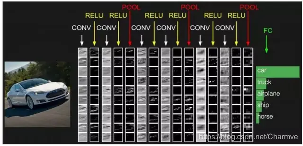 其实卷积神经网络依旧是层级网络,只是层的功能和形式做了变化,可以说是传统神经网络的一个改进。比如下图中就多了许多传统神经网络没有的层次。
