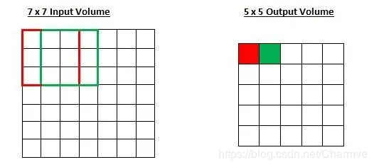 这里的蓝色矩阵就是输入的图像,粉色矩阵就是卷积层的神经元,这里表示了有两个神经元(w0,w1)。绿色矩阵就是经过卷积运算后的输出矩阵,这里的步长设置为2。