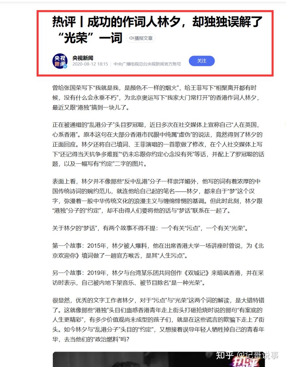 文章除了怒斥林夕的“港独”行为,还说除了涉及林夕的两个传闻。第一个传闻是,2008年的北京奥运会主题曲“北京欢迎你”,林夕在某大学演讲上,称为是其“人生污点”。第二个传闻是,林夕听到自己的作词作品以及节目在大陆被除名,称为是一种“光荣”。