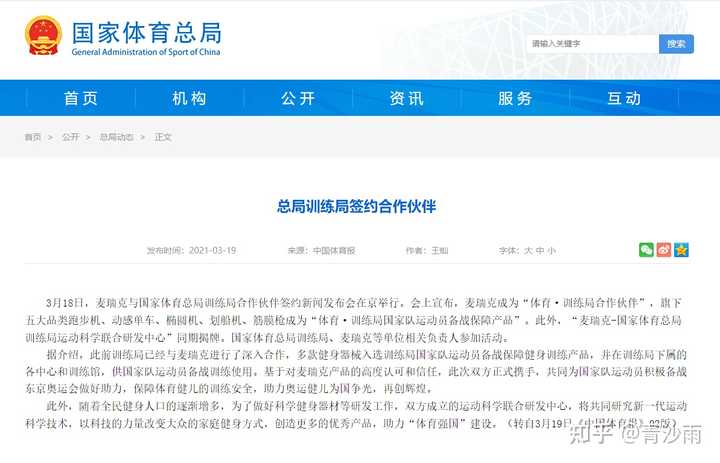 提前做过一些功课,发现了麦瑞克这家主做家用健身器材型号的品牌,除了跑步机,还有动感单车、椭圆机等等,品牌号称是和国家体育总局有合作,那我自己也要查一下真伪,果然是去年3月份,国家体育总局的官网上有一条动态,显示总局和麦瑞克签约的报道。