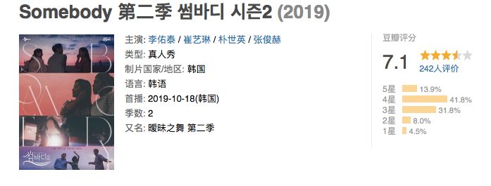 2018年底,韩国Mnet电视台推出一档恋爱综艺《暧昧之舞 Somebody》,这档节目也被称为是加强版的《Heart Signal》,第一季豆瓣评分达:7.7分。以舞蹈为切入口,在恋爱的基础上进行创新,《暧昧之舞 Somebody》与以往恋爱节目最大不同就是舍弃了演播室,试图打造沉浸式体验。